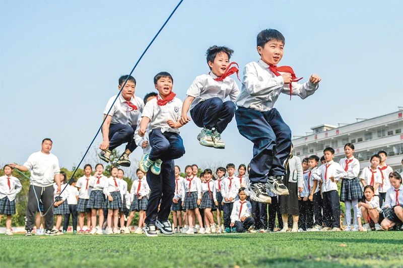 近年來,各地中小學積極落實“健康第一”教育理念,實施學生體質強健計劃,讓學生更加健康、陽光、自信地成長。圖為2025年3月25日,湖南省永州市道縣朝陽小學,學生們在課間跳長繩。 人民圖片 蔣克青/攝